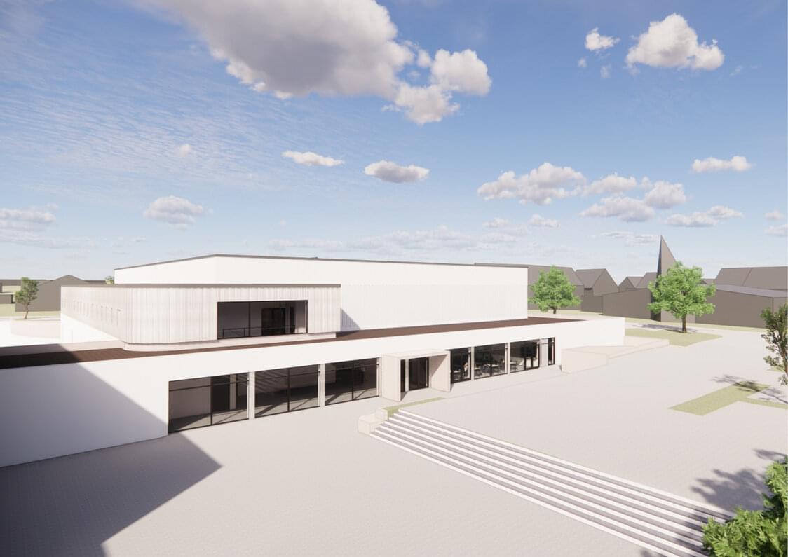 Die Dreifachsport- und Mehrzweckhalle in Kombination mit einer Schulmensa und -küche soll sowohl für den Schul- und Vereinssport, als auch für Veranstaltungen mit bis zu 1.200 Besucher genutzt werden. An das Foyer ein Speisesaal mit Zubereitungsküche angegliedert. In der Großküche werden täglich ca. 300 Speisen für die Ganztagsschüler der nahen Grund- und Mittelschule, sowie für einen Kindergarten frisch zubereitet. Daneben plant die Gemeinde Eckersdorf auch bei Veranstaltungen Gastronomie anzubieten. Durch den Haupteingang des Neubaus gelangt man in das teilweise zweigeschossige Foyer, von dort aus führt eine freie Treppe mit Sitzstufen ins Obergeschoss. Zwischen dem Foyer des Neubaus und der Schule ist der WC Bereich als eingeschossiges Bindeglied angebaut. Die Achse des bestehenden Schulflurs wird damit bis ins Foyer des Neubaus gezogen. Vom Foyer aus gelangt man sowohl in den Speisesaal mit angrenzendem Küchenbereich in Richtung Norden, als auch direkt in die Dreifachhalle im Westen. Durch die vorhandene Topographie ist die Halle im Norden um etwa ein Geschoss eingegraben. Im Süden grenzen an die Halle Funktionsräume wie Erste-Hilfe Raum, Regieraum und die barrierefreie Umkleide, als auch Technikflächen im Erdgeschoss.