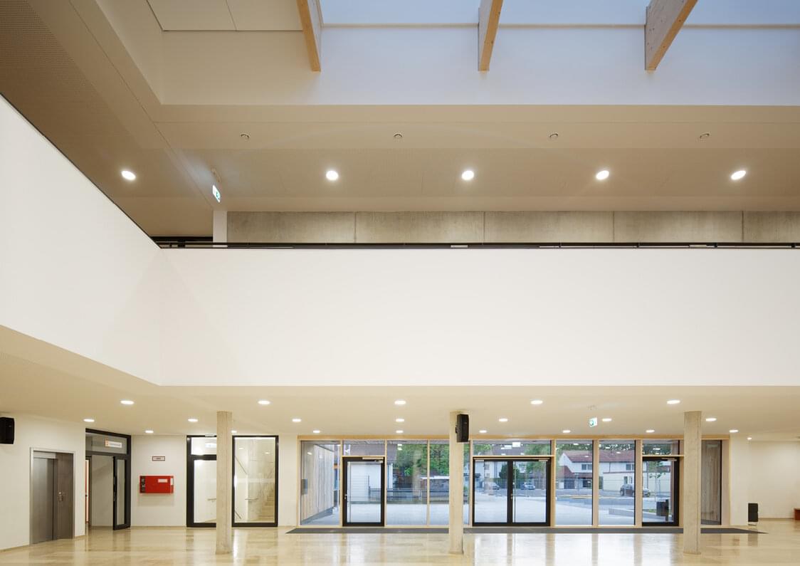 Der Neubau wurde für 22 Klassen mit ca. 420 Schülern mit den entsprechenden Fachklassen für Naturwissenschaften, Hauswirtschaft, Kunst und Werken sowie einer Ganztagesbetreuung realisiert. Im UG wurden die Technikräume, Lagerräume sowie die Fachklassen untergebracht. Im EG befinden sich der zentrale Eingangsbereich mit Aula, Musik- und Mehrzweckraum. Der Musikraum ist der Aula zuschaltbar. Zwischen den Klassenzimmern im OG sind beidseitig zugängliche Gruppenräume angeordnet. Ebenso im EG befinden sich Mensa und Ganztagesbetreuung sowie Verwaltung und Lehrerbereiche. Das Obergeschoss dient komplett den Klassenzimmern. Um das Motiv der benachbarten Grundschule aufzunehmen, wurde als Fassadenbekleidung eine senkrechte Holzverschalung vorgesehen, welche durch horizontale Fugen gegliedert wird. Das Motiv der Bandfenster wird wieder aufgenommen, um so einen harmonischen Gesamteindruck eines Campusgeländes zu schaffen.