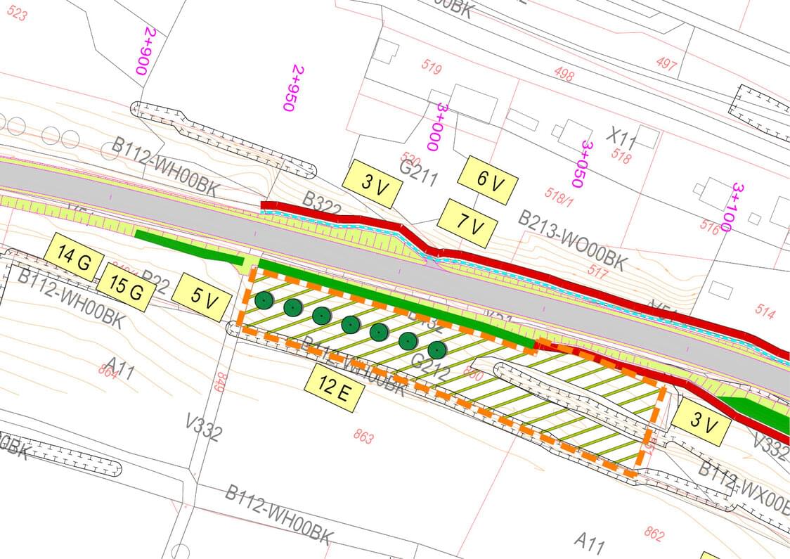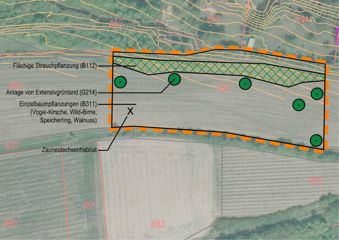 Die Bundesstraße 22 sollte westlich von Dettelbach auf einer Länge von ca. 2 km Länge grundhaft erneuert werden, da die bestehende Trasse nicht dem nach heutigen Kriterien erforderlichen Ausbaustandard entsprach. Zur Bewältigung der naturschutzrechtlichen Eingriffsregelung wurde der landschaftspflegerische Begleitplan (LBP) erarbeitet. Zusätzlich wurde der artenschutzrechtliche Fachbeitrag erstellt, der v. a. im Hinblick auf das Vorkommen von Fledermäusen und Zauneidechsen die notwendigen landschaftsplanerischen Maßnahmen benennt. Wesentliche Beeinträchtigungen von Natur und Landschaft sind der Verlust von ca. 4.000 m² straßenbegleitenden Gehölzflächen und einigen älteren Einzelbäumen durch Versiegelung und Überbauung sowie die damit verbundene Beeinträchtigung des Landschaftsbildes. Die notwendigen Vermeidungsmaßnahmen werden dargestellt (z. B. Errichtung von Biotopschutzzäunen, Bauzeitenbeschränkung, endoskopische Untersuchung von Höhlenbäumen im Eingriffsbereich, Schutzmaßnahmen im Hinblick auf Zauneidechsenvorkommen). Die Ermittlung des Kompensationsbedarfs erfolgt nach der Bayerischen Kompensationsverordnung (BayKompV) und ist in Karten und Tabellen dokumentiert. Anforderungen an das Maßnahmenkonzept ergeben sich auch aus dem Artenschutzrecht nach dem Bundesnaturschutzgesetz. Als vorgezogener Ausgleich für die Lebensraumverluste wurden auf einer Ackerbrache neue Habitatstrukturen (Wurzelstöcke, Sandschüttung, Steinhaufen) angelegt; Ansaat und Nutzung der Fläche als Extensivgrünland sowie Gehölzpflanzungen am nördlichen Rand erfolgen später. Die Beeinträchtigungen des Landschaftsbildes werden durch Gehölzpflanzungen (Hecken, Gehölzgruppen, Einzelbäume) bzw. Sukzession im Bereich der neuen Böschungen ausgeglichen.