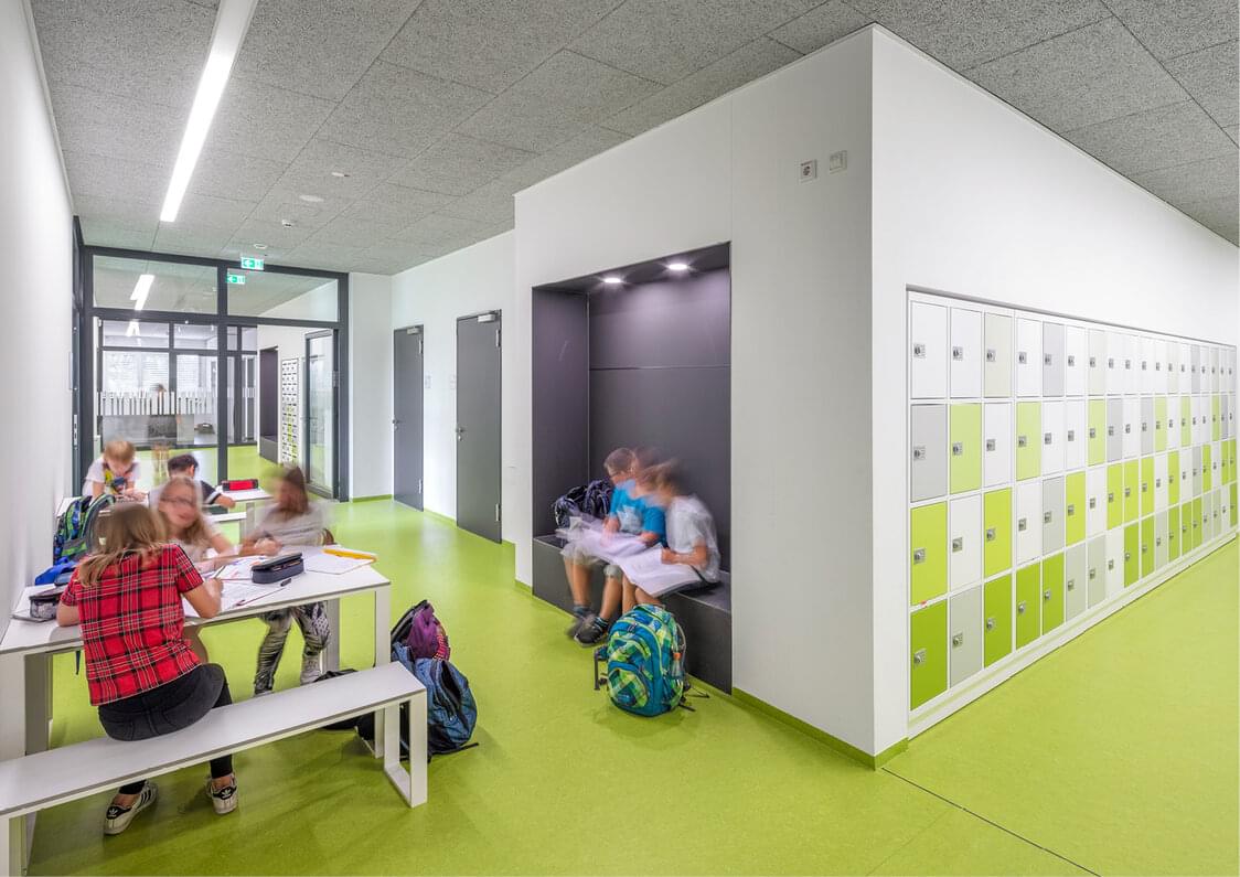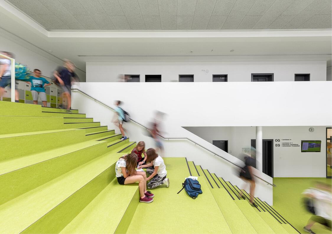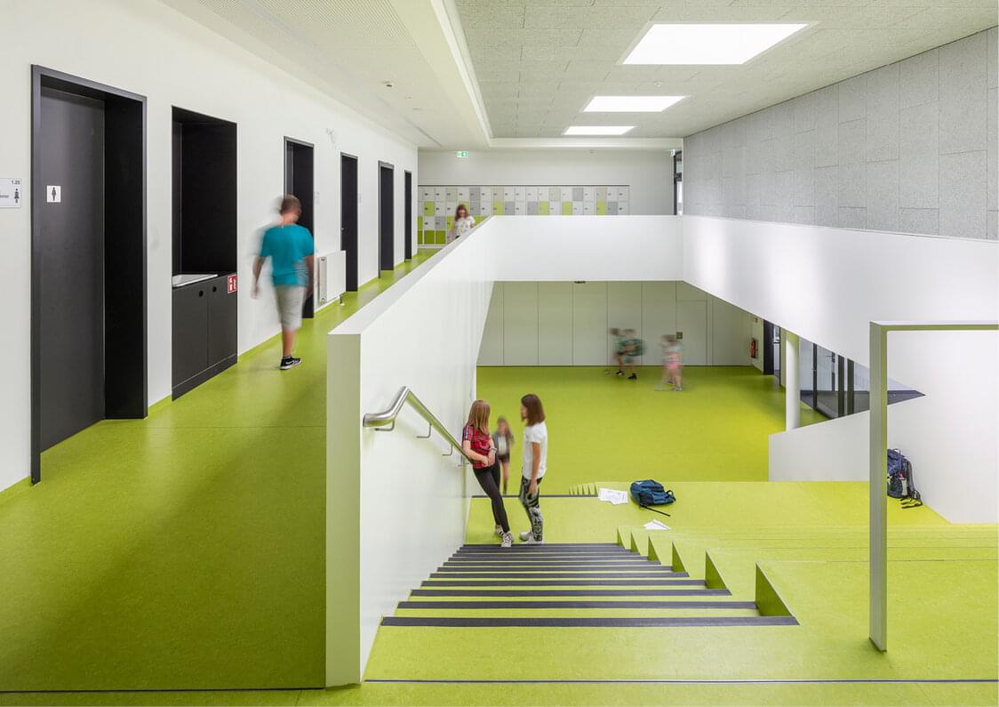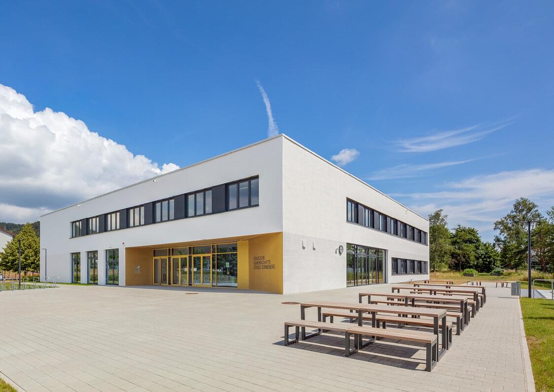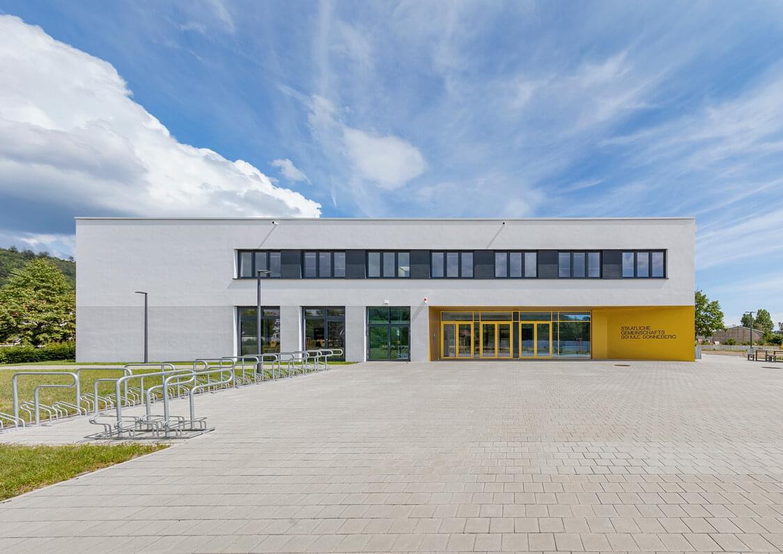 Für die Gemeinschaftsschule Sonneberg ist ein Neubau für ca. 500 Schüler geplant. Die Schule wird von Westen über einen großzügigen Vorplatz mit Schattenbäumen und Sitzmöglichkeiten von der neugeplanten Busschleife mit Haltestelle erschlossen. Der Vorplatz bildet mit der das Gebäude umgebenden, gepflasterten Fläche den allwettertauglichen Pausenbereich, der neben freien Spiel- und Bewegungsflächen auch diverse Sitz- und Aktionsmöglichkeiten bietet. Zentrales Element des Schulhofes stellt die große Sitzstufenanlage dar, die zwischen dem oberen und unteren Pausenbereich vermittelt und einen attraktiven Aufenthalts- und Funktionsbereich (Grünes Klassenzimmer, Theateraufführungen, etc.) bietet. Der untere Pausenbereich ist von einer teilbefestigten Freifläche, den Aktionskreisen und dem zentralen Schulbaum geprägt. Im Gegensatz zum befestigten, streng geometrisch gehaltenen oberen Teil des Pausenhofs stellt der ca. 2m tiefer liegende Pausenhof das natürlichere, mit organischen Formen gestaltete Pendant dar. Diese Fläche dient dem Aufenthalt und dem freien Spiel und soll in den nächsten Jahren durch schulische Aktionen selbst kreativ gestaltet werden. Zur räumlichen Begrenzung wird der südliche Pausenbereich mit einer naturnahen Hecke eingefasst, die vereinzelt mit schattenspendenden Solitärbäumen überstellt ist. Ein gepflasterter Weg im Westen des Pausenhofs verbindet die beiden Schulhofebenen barrierefrei. Die südlich und östlich unmittelbar an das Gebäude angrenzenden Flächen sind für blütenreiche Pflanzungen vorgesehen, die durch die Schüler selbst gestaltet werden sollen.
