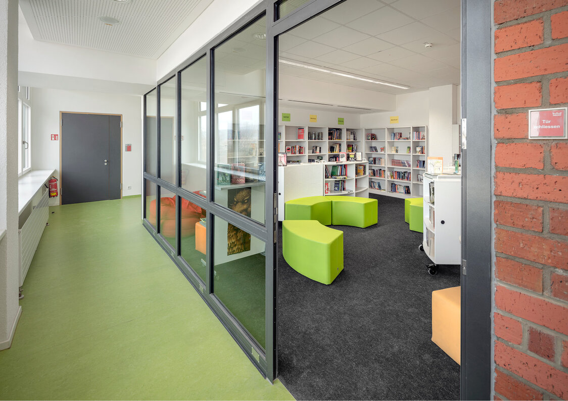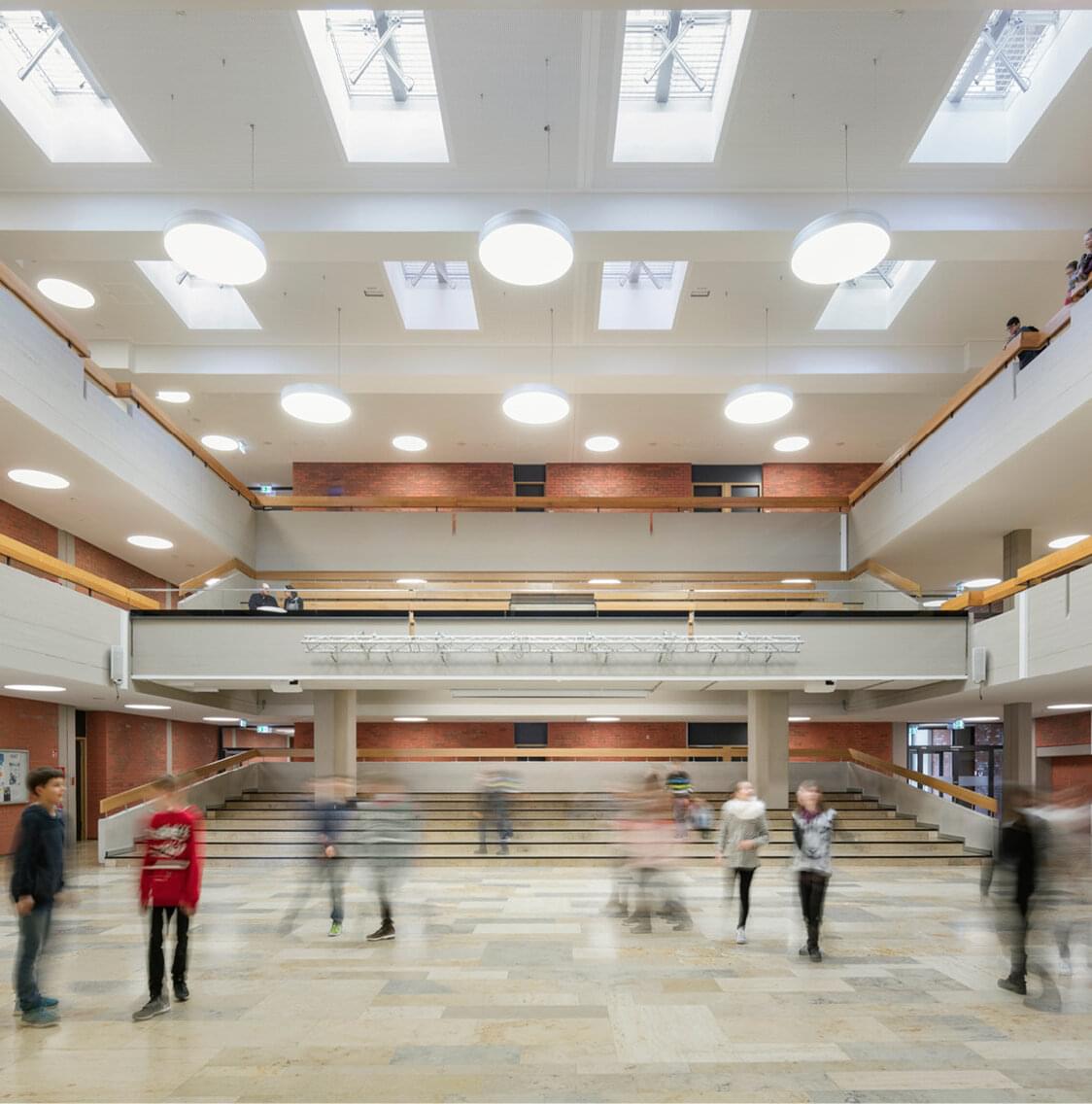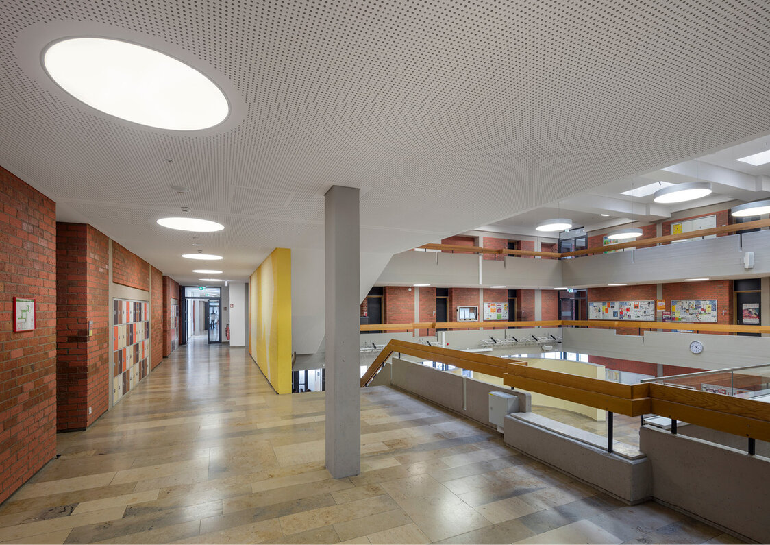 Drei zentrale Lüftungsanlagen versorgen zentrale Bereiche wie WC-Anlagen, Verwaltungsbereich und Schülerbereiche. Die Klassenzimmer werden über dezentrale Deckenlüftungsgeräte mechanisch be- und entlüftet.