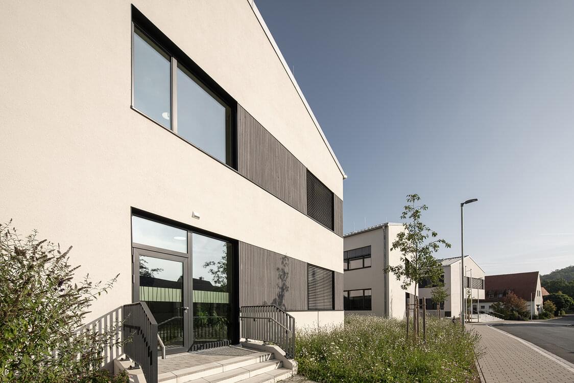 Der Neubau und das verbleibende Gebäude der Mensa bilden mit den vier baulich verbundenen Schulgebäuden eine sog. Campus-Lösung. Die Gebäude ordnen sich durch die Zwei Geschossigkeit, den flach geneigten Satteldächern und die Putzfassade mit Holzelementen städtebaulich gut in die Umgebung ein. Im lang gezogenen Gebäude im Osten des Schulgeländes befindet sich der Hauptzugang an der Ecke Goethestraße / Landwehrstraße. Von dort aus erstrecken sich die zwei Schulachsen nach Norden, zur Aula, den Musikräumen und der Mensa, sowie nach Westen zu den Klassenräumen und dem Fachraumhaus als Abschluss des Schulkomplexes. Im Fachraumhaus befinden sich die Fachbereiche Chemie, Physik, Biologie und Kunst, sowie die Informatikräume und die Technikräume im Untergeschoss. Die Verwaltung findet im Obergeschoss des lang gestreckten Baukörpers im Osten neue Räumlichkeiten mit Schulbibliothek und Lehrerzimmer. Alle Neubauten wurden nach aktuellem Stand der Technik ausgestattet. Die Unterrichtsräume sind durch zentrale Lüftungsanlagen be- und entlüftet und das Fachraumhaus wurde mit einer Photovoltaikanlage auf dem Dach versehen. Mit den neu konzipierten Außenanlagen bilden die Neubauten einen modernen Schulcampus in Scheinfeld, der den Anforderungen für den Schulalltag mit rund 500 Gymnasiasten gewachsen sein wird.
