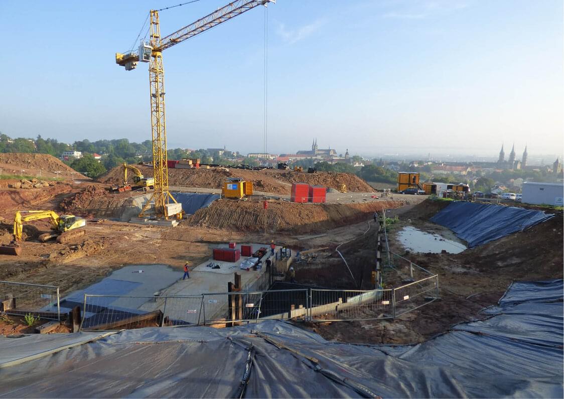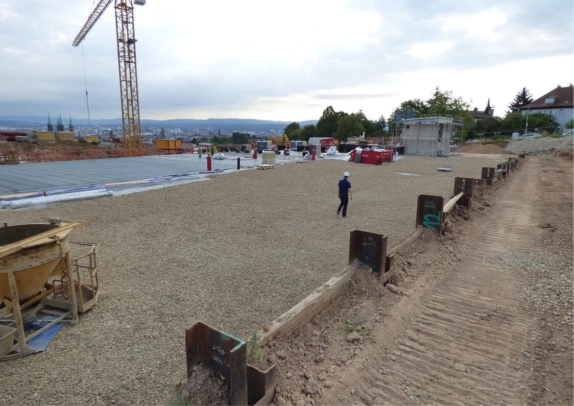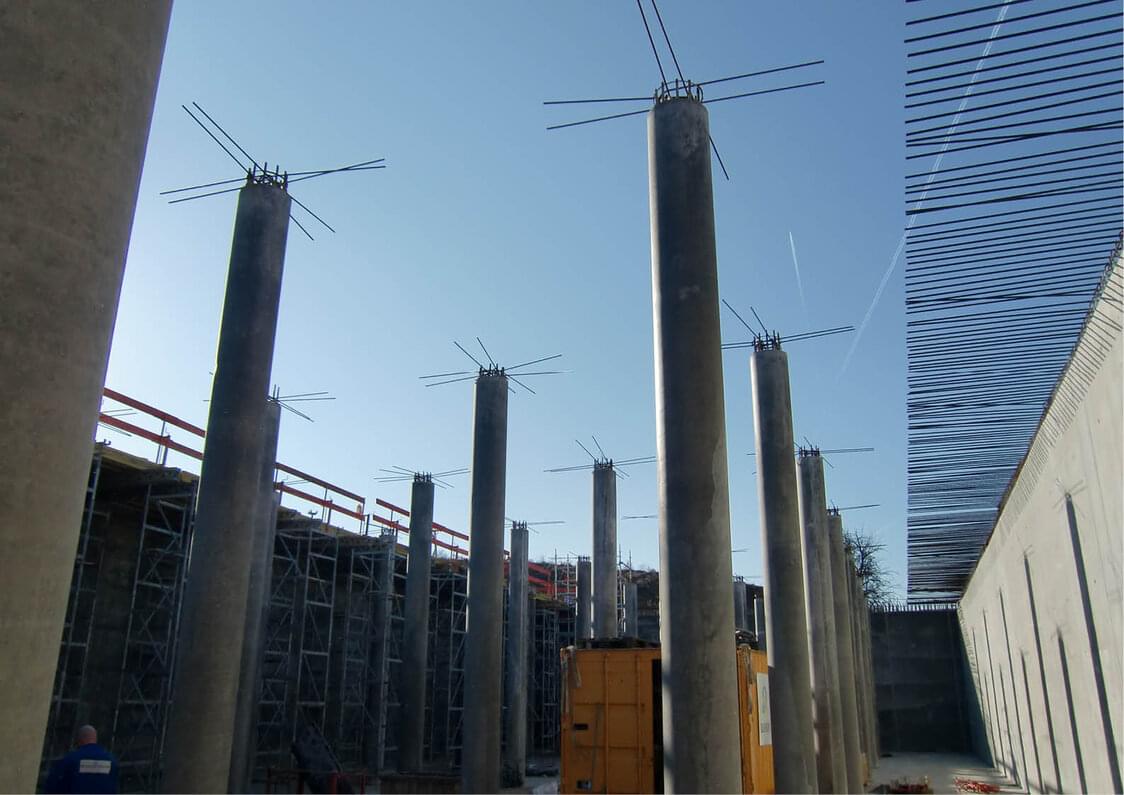 Zweifach rückverankerte Trägerbohlwand als Baugrubensicherung; dehnfugenlose Bauweise; komplett als WU-Konstruktion; hohe Bewehrungsdichte; Erdüberschüttung der Wasserkammerdecke bis ca. 4,0 m; Auftriebsnachweis.