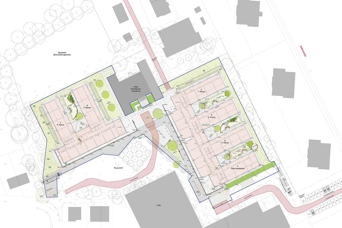 Wegen der statisch ausgereizten Konstruktionsweise sollen möglichst nur geringe Eingriffe in den Bestand erfolgen. Sanierung und Erweiterung sollen während des laufenden Betriebes zunächst für die Pavillons A und B erfolgen, die Pavillons C – F folgen im Anschluss. Klassen der betroffenen Pavillons finden im L-Bau Platz. Es wurde festgelegt, dass die Räume für die Schulsozialarbeit in Pavillon F verbleiben. Ein Abbruch wird nicht geplant. Die Barrierefreiheit ist herzustellen. Maßnahmen zur Amokprävention sind zu planen.