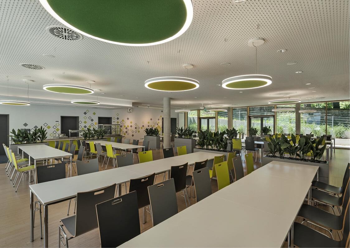 Die Erweiterung der Grundschule Schillerschule umfasste vier Klassenzimmer mit benachbarten Gruppenräumen, einer Mensa mit Verteilerküche und einer neu organisierten Verwaltung für die Nutzung als Gemeinschaftsschule. Der Neubau präsentiert sich als eigenständiger Baukörper und schließt sich mit einer gläsernen Trennfuge über 3 Geschosse an den Bestand an. Im neuen Gebäudeteil ist ein Treppenhaus mit Split-Level angeordnet, welches die Höhen des Bestands aufnimmt und gleichzeitig eine eigenständige Höhenentwicklung der Erweiterung zulässt. Über einen Aufzug sind alle Geschosse barrierefrei erschließbar. Da das Gelände ein starkes Gefälle aufweist, schiebt sich das Gebäude im Süden mit der Nebenraumzone in den Hang. Im EG sind der Eingangsbereich mit Aula und Mensa angeordnet. Der Bereich mit beidseitig großflächiger Verglasung ermöglicht flexibel verschiedenste Nutzungsformen. Daran angeschlossen befinden sich die Verteiler- und Spülküche samt Nebenräumen sowie Lager- und Technikräume. In den beiden Obergeschossen sind die Klassenräume mit benachbarten Gruppenräumen und den neuen Räume der Verwaltung angeordnet. Dazu gehören neben dem Sekretariat und Büros für die Schulleitung auch das neue Lehrerzimmer, ein Elternsprechzimmer, entsprechende Neben- und Sanitärräume.