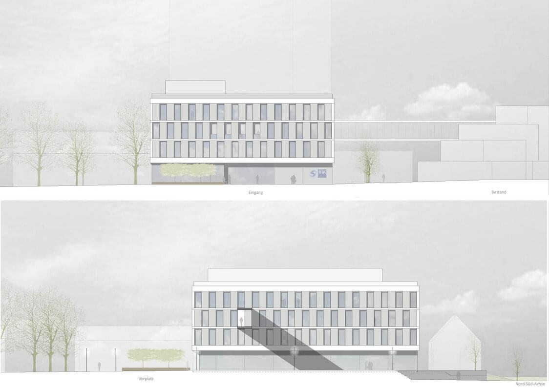 Der durch seine kubische Form bewusst zurückhaltend gestaltete Neubau des neuen Weiterbildungszentrums wird am Nordrand des Eckgrundstückes platziert. Dadurch werden die nördlich des Sentmaringer Wegs gelegenen Bauten als im Park stehende Solitäre interpretiert, in deren Abfolge sich das neue Gebäude entfügt und die es zu einem Ensemble verdichtet. Durch die präzise Setzung zum bestehenden, bislang etwas versteckten Altbau rückt dadurch die Institution der IHK als Ganzes nach vorne. Leitidee ist die Schaffung eines der Aufgabe optimal angemessenen Baus unter Wahrung der Wirtschaftlichkeit. Nach außen vermittelt der kompakte Baukörper die einem Lehrgebäude entsprechende Zurückhaltung. Nach innen entwickelt sich über das großzügige Foyer, ein von oben belichtetes Atrium und die verbindende Kaskadentreppe ein leicht verständliches Gefüge, das innenräumlich vielfältige Dimensionen aufweist. Die einfach-kubische Grundstruktur ermöglicht eine klare und nachvollziehbare Verteilung der Nutzungen und eine hohe Flexibilität. Der Grundriss ist durchgängig auf allen oberirdischen Geschossen in drei unterschiedlich breite Zonen strukturiert, wobei der mittlere Bereich als Erschließungs- und Aufenthaltsbereich dient. An den Enden dieser Mittelzone sind jeweils kleinere Galerien oder Räume mit Ausblicken angeordnet. Das Äußere des Neubaus vermittelt einen technoid-rationalen Gesamteindruck. Die Fassade der Eingangsebene wirkt durch die umlaufend hohe Verglasung einladend und transparent. In den Obergeschossen werden die geschlossenen Flächen von hellen Metalloberflächen geprägt, die Öffnungen in einem Wechsel aus transparenten und opaken, grünlichen Glasflächen. Innerhalb dieser durch Vor- und Rücksprünge gegliederten Kombifassade wechseln sich die bündig in der Fassadenebene liegenden transluzenten Glaselemente mit geschosshohen, zurückspringend transparenten Glastafeln ab.